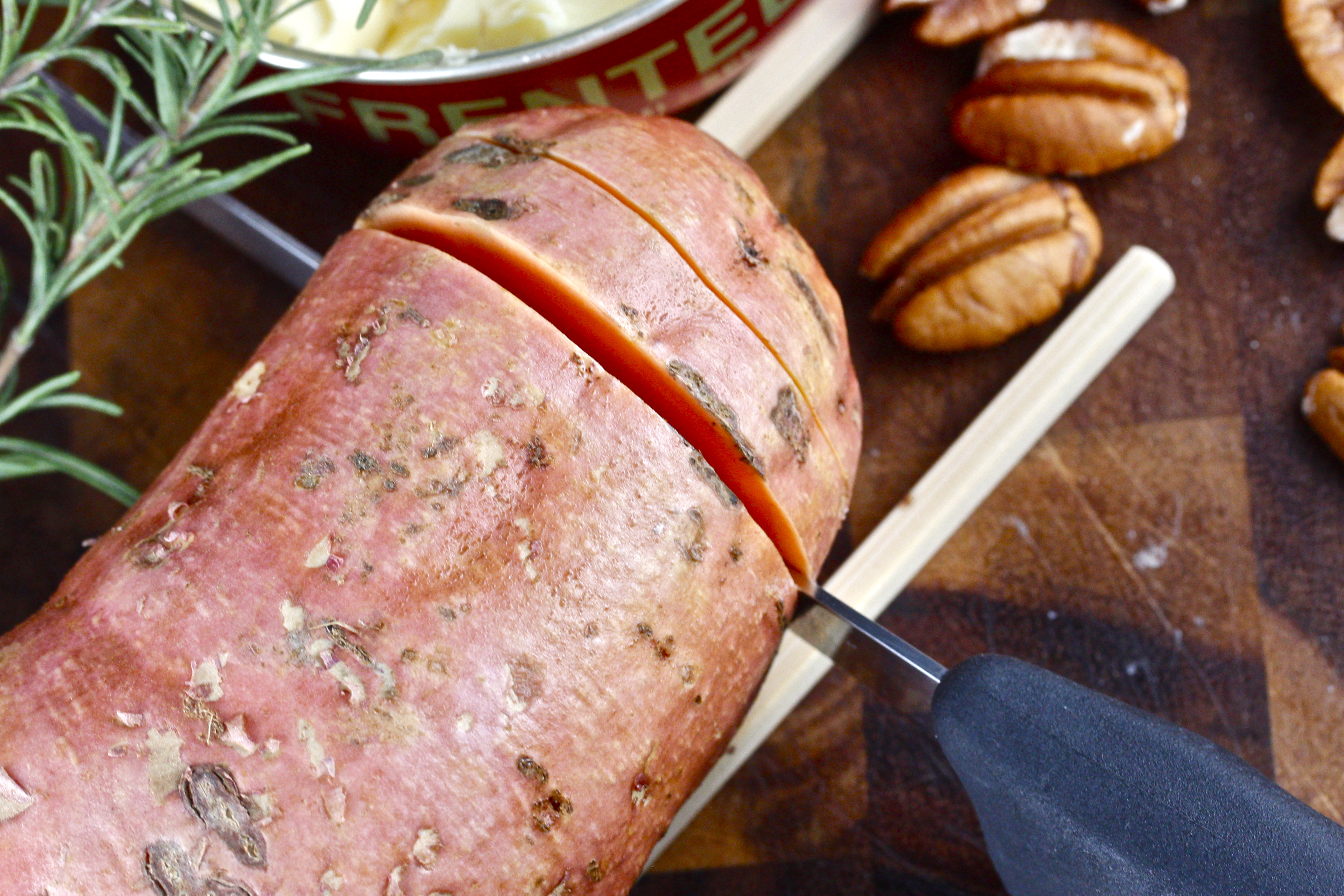 These ingredients are not hard to find, but I was lucky to find some extra long Louisiana sweet potatoes at The Fresh Market – the perfect size for making this dramatic squeezebox sweet potato dish. The pecans come from my friend Jady Regard at Cane River Pecan Company in New Iberia, and of course, Steen’s is a staple in my pantry.